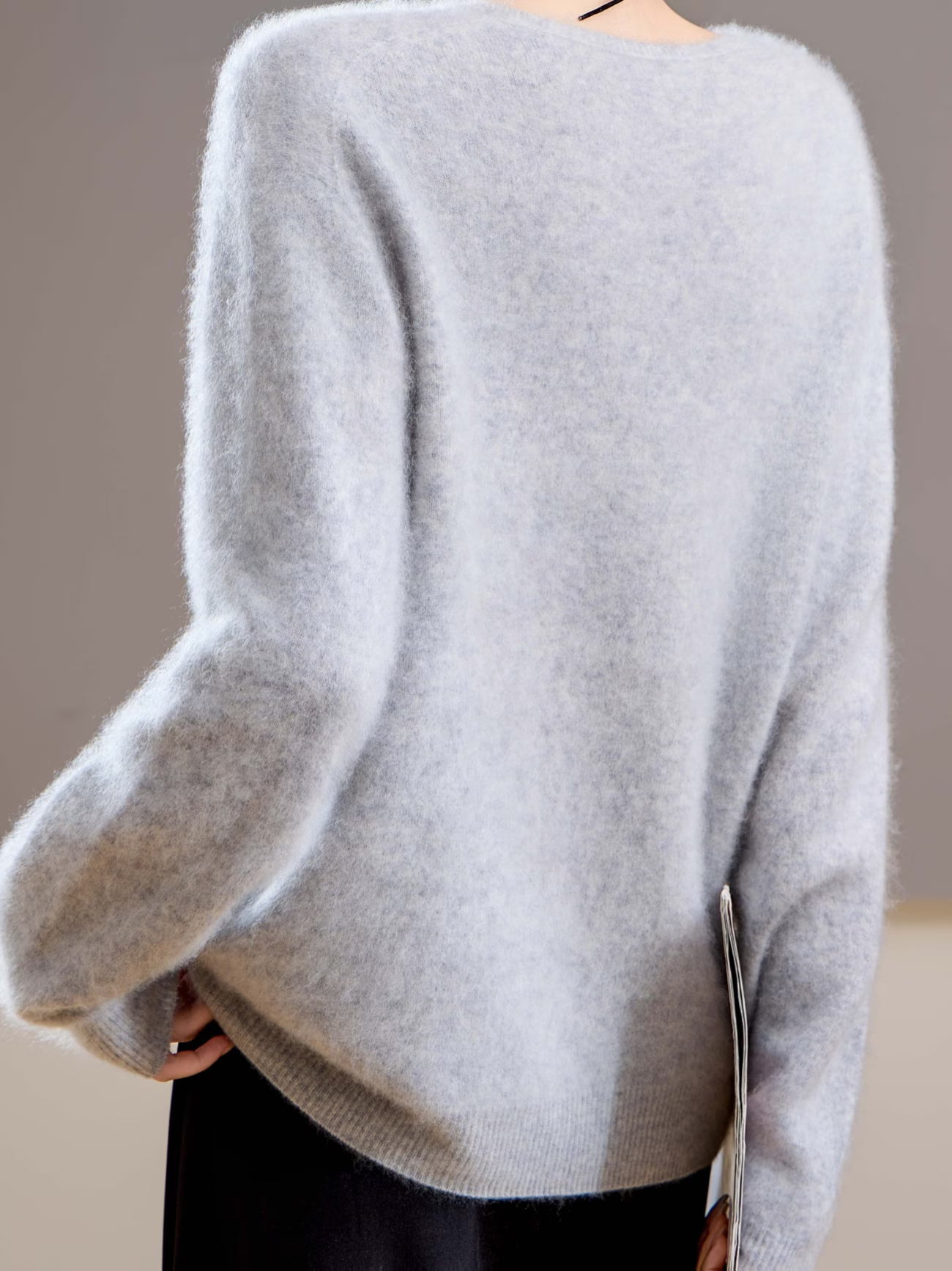 Slightly loose straight cut. Delicately fluffy knit with a soft drape. Clean V-neck, bright under a jacket or worn alone.